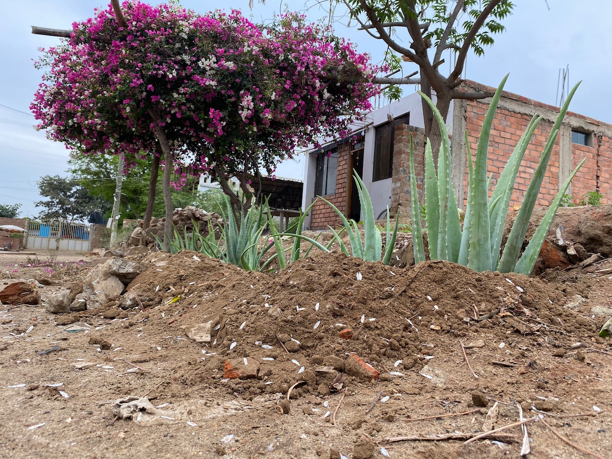 Les damos la bienvenida a las personas de cualquier lugar, Es una casa en zona rural saliendo al campo, con una pequeña quinta de gras y arboles, cuenta con piscina pequeña para relajarse, 3 dormitorios, cocina (utensilios de comer, cocina, frigobar), una sala, agua y desague, esta cerca a mayascón, bosque de pomac, a 1 hora de la ciduad de chiclayo.