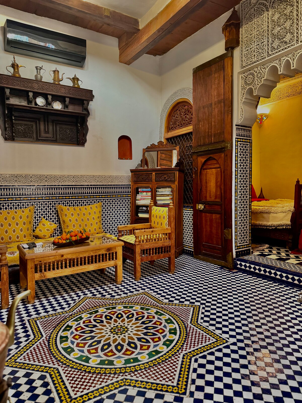 Masterfully blends timeless Moroccan style with modern design Located in the heart of the old Fez Medina. Offers an unparalleled experience. The expansive suite features a large bedroom, living room adorned with Moroccan mosaic private bathroom and air conditioning. Hand-picked furniture and exquisite fabrics create an atmosphere of elegance. Start your day with a delightful breakfast on your private terrace and enjoy ultimate peace and privacy. Experience the magic of Morocco like never before!