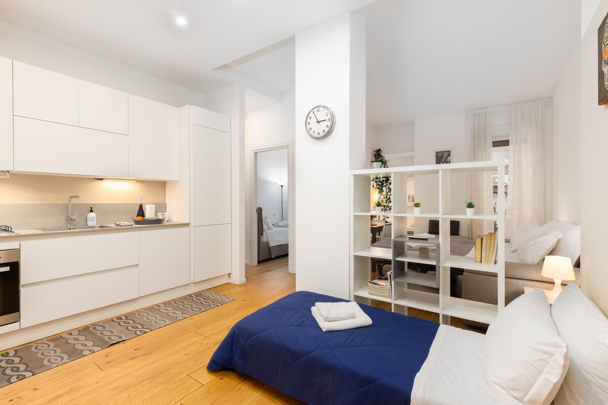 Lovely third floor studio in the heart of Milan, right next to Arco della Pace. Adjacent to the newly renovated apartment is a terrace facing Piazza dei Volontari square. Spend your day enjoying a walk in the beautiful Parco Sempione and visiting the city's landmarks (all below a 20min walk). At night this area transforms in one of the trendiest in Milan, with a great variety of restaurants and bars. Be aware that since the apartment is in a liberty building from 1924 there is no elevator.