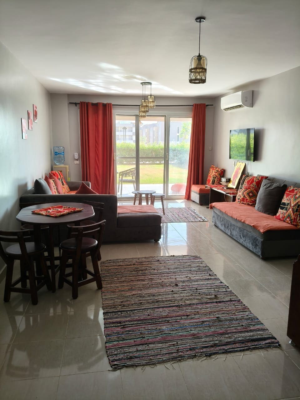 { Red Carpet village } Relatively big Chalet of 140 meters, 2 bedrooms,5 beds with extra mattresses ,1 bathroom and an open kitchen,2 Air conditioners, Have a great vacation away from Cairo congestion, enjoy your privacy. Experience the Red sea ! The place has a unique BBQ facility and a large 49'inch 4k HD LG TV plus an HD cable for Laptop or PlayStation . NB : the glass table has been replaced by a wooden one for safety measures. As the place is having valuable items,yo may be asked insurance