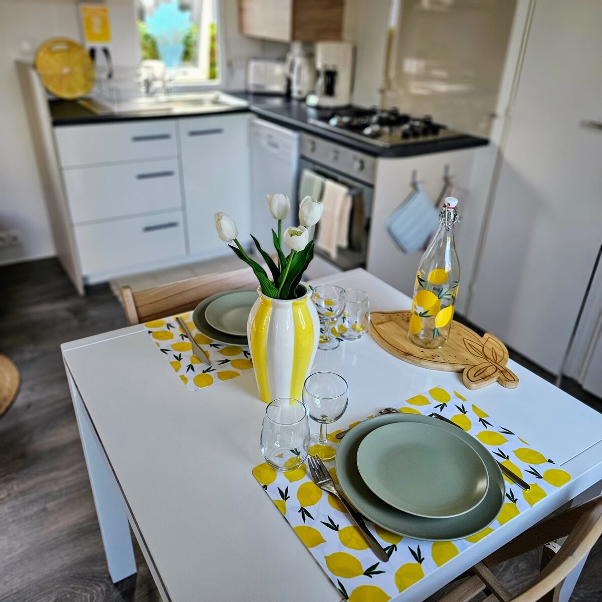 Mobile home for 6 people with 3 bedrooms, located within the 3-star La Baie du Kernic campsite in Plouescat, North Finistère, with an indoor heated swimming pool from April to September and an outdoor swimming pool open from June to September. The kitchen is equipped for 6 people and includes a microwave, a refrigerator, a 4-burner gas hob, mini oven, classic coffee maker, electric kettle + Dolce Gusto coffee maker, TV. Wooden terrace with barrier with 1 table and 6 chairs.