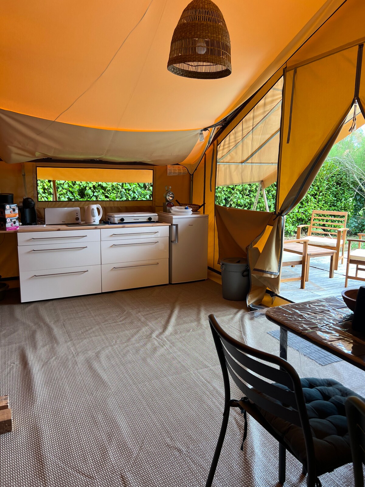 Enjoy the lovely setting of this romantic spot in nature. Our lovely tent has everything you need to make your camping trip memorable. Our tents are cosy and have a double bed. It includes all bedlinen and extra covers and a hot water bottle. There is an outside seating area with a small camping kitchen with a fridge and gas burner. All pots and pans are provided.