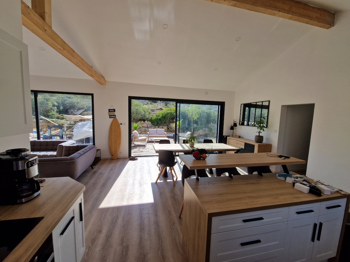 Plus qu'une simple maison de vacances, cette villa est un lieu de vie aux volumes généreux, conçu pour ceux qui cherchent à concilier déconnexion totale et confort moderne. Dès l'entrée, le ton est donné : une architecture qui favorise la lumière naturelle et la circulation fluide. C'est un véritable cocon design, idéal pour se ressourcer en hiver ou profiter de la douceur des mi-saisons.