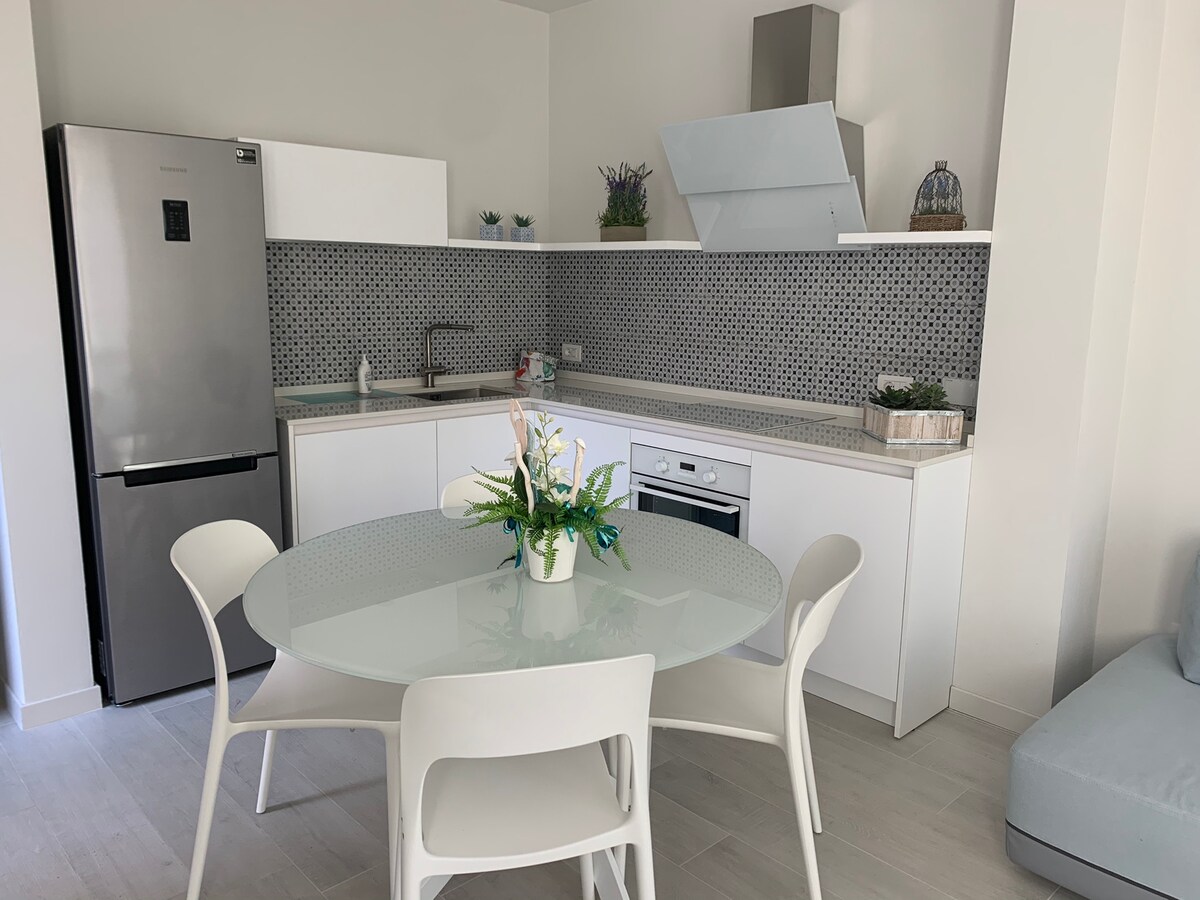 The accommodation is located just 100 meters from the sea on the first floor of a small building that has been completely and recently renovated. Consisting of a large living area with sofa and SmartTV; kitchen equipped with every comfort (dishwasher, oven, microwave, toaster, etc.). Two double bedrooms and two bathrooms. Bed linen and towels are provided by us. Wi-Fi. Air conditioning. The property includes a large terrace adjacent to the living area, equipped with a table and chairs, and a private parking space