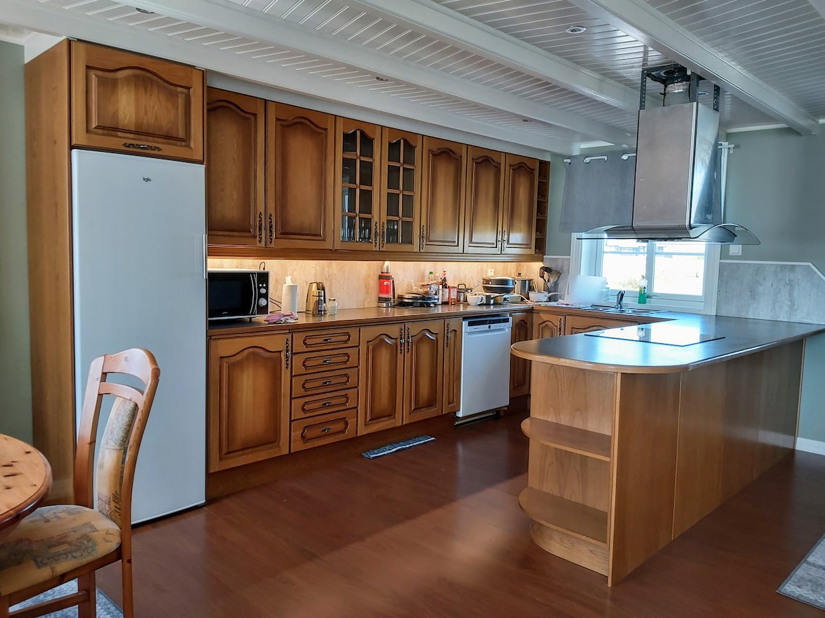 One bedroom on the ground floor with a large bulk-bed. Two bedrooms upstairs, one with two singel beds and one with a king-size bed. All rooms with superb beds and wonderful pillows and duvets. All bedrooms has blinds for the midnight sun :) On this floor we also offer a seating area with a large smart-TV and a great view over the landscape and the Atlantic Ocean.