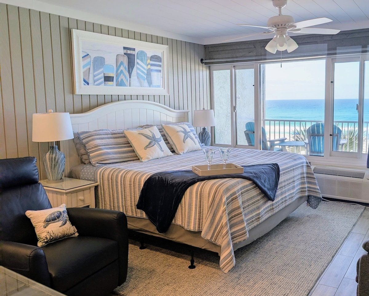 Newly renovated [Sep 2017] modern luxury studio with breath taking gulf views, walking distance to Pier Park and Gulf world and loads of amenities such as heated pool, hot tub, GYM and mini movie theater. This is a studio with a kitchenette that houses a mini fridge, microwave oven, toaster and a mixer if you opt for a home made margarita. Please check out our other 1BR and 2BR listings as well. Building is situated across the street from Sharky's. Property is beach front but not on the beach.