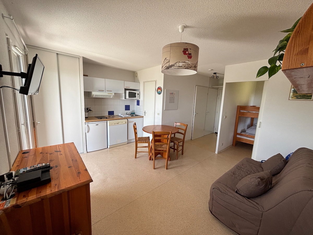 26 m2 studio for 4 people with balcony, closed cabin with 2 bunk beds, 1 main room with a 140 x 200 sofa bed, TV, equipped kitchen (ceramic cooktop, microwave, dishwasher, fridge), table and chairs, bathroom with bathtub, 1 separate toilet, free Wi-Fi. 1 balcony with garden furniture, sunny in the morning. 1 Parking, open pool in high season, 1 laundry, 1 Ski locker. The studio is 500 m from the city center, served by free shuttles.