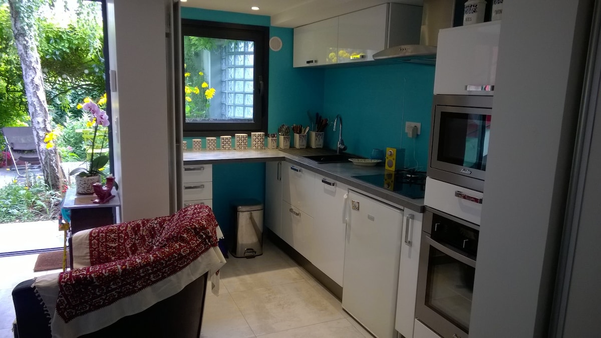 🏡 Logement T2 de 25 m² rénové en 2025, au calme et frais l’été. Entrée privative sur un jardin, séjour lumineux avec cuisine équipée et canapé convertible. 🛏️ Chambre avec lit Queen size, salle d’eau, WC séparés. Quartier résidentiel le long de la coulée verte, commerces et restaurants. 🚗 Stationnement gratuit à proximité immédiate du logement. 🚉 Transports : 5 minutes à pied (500m) de la gare "Fontenay-aux-roses" du RER B. Wifi, 🚭 non-fumeur.