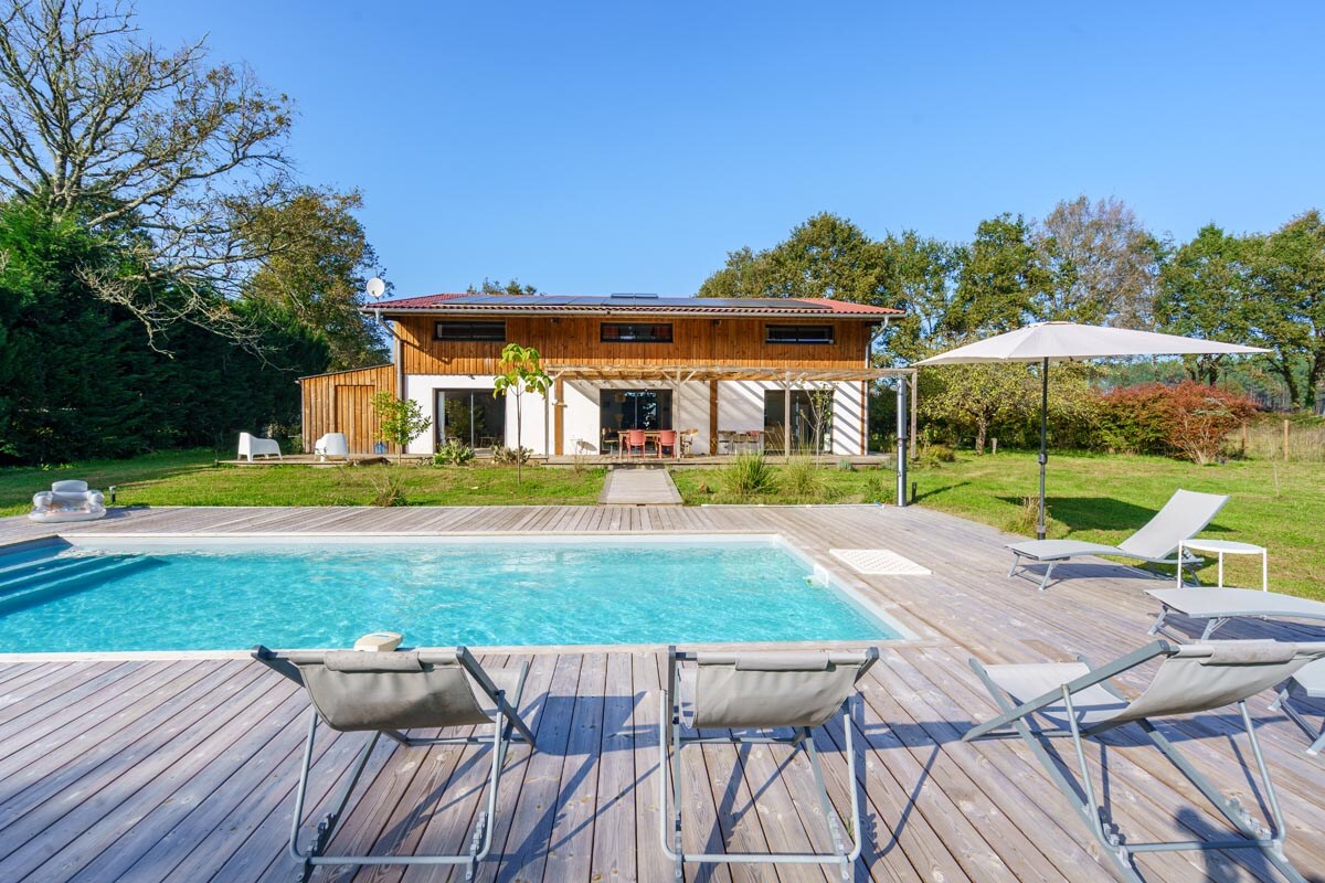 New house surrounded by forest next to the bike path and beaches of the Landes coast It consists of a living room with open-plan kitchen, 3 bedrooms including 1 master suite with bathroom and toilet, and another bathroom and separate toilet. Fiber internet 🛜 Outside, a south-facing swimming pool of 4 by 8.5 m heated from April to November 11 with landscaped garden and 110 m2 of wooden terrace. Moliets-et-Maa beach and golf 10 minutes away Vieux Boucau 15 min Hossegor 28 min. Biarritz 50 min