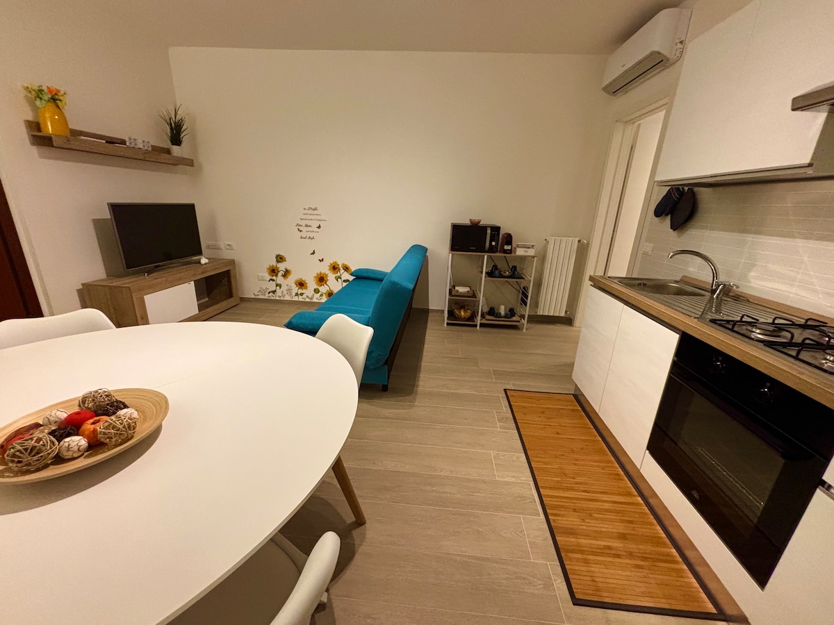 Appartamento indipendente di circa 50 metri quadrati appena ristrutturato e dotato di ogni comfort (macchina caffè nespresso, microonde, smart tv, wifi, lavatrice e asciugatrice, aria condizionata e zanzariere) Si tratta di un bilocale con due ambienti separati, si compone di ingresso su cucina, zona pranzo e angolo relax con due poltroncine... per poi arrivare nella zona notte con ampia camera matrimoniale e bagno molto ampio completo di tutto, doccia 90x120, wc e bidet