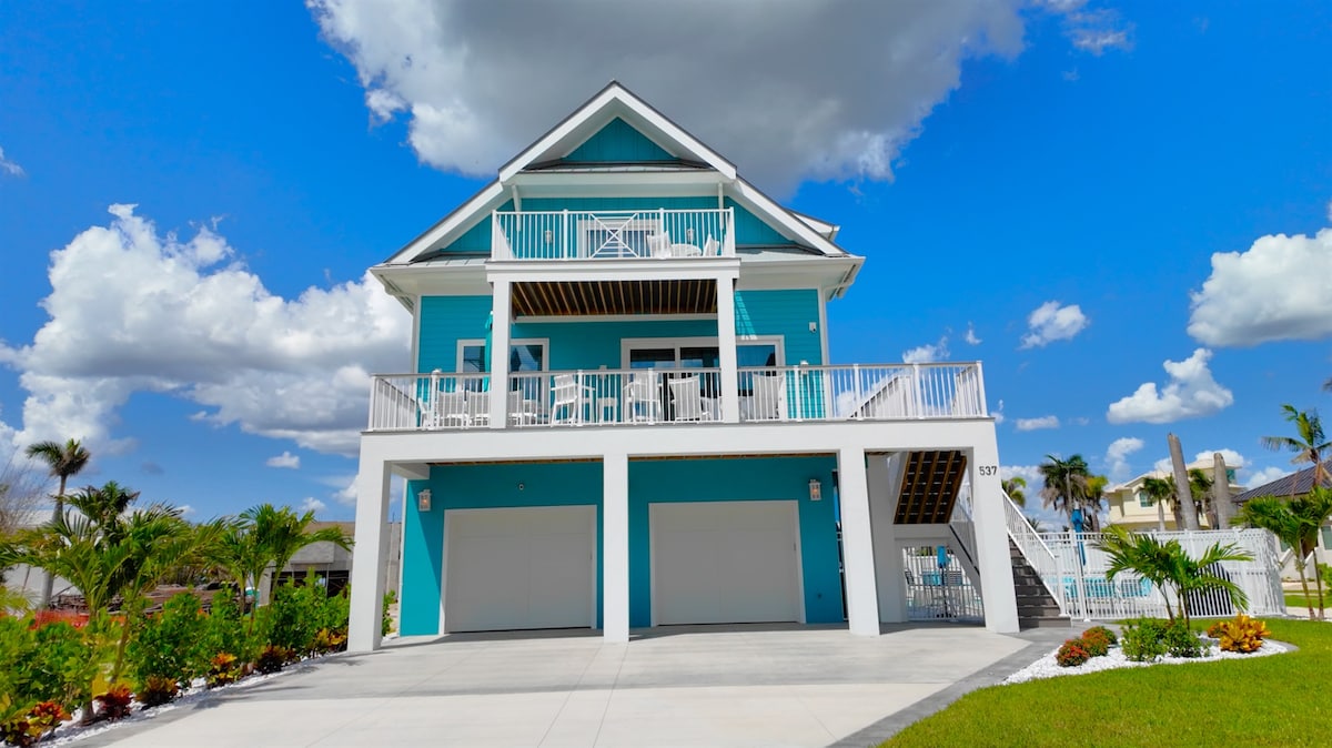 Welcome to Blue Lagoon, a vibrant, custom 4-bed, 4-bath Fort Myers Beach retreat. Bathed in soothing aqua tones, this home offers open-concept living, multiple balconies with water views, and a private pool & spa. Each beautifully appointed bedroom has an en-suite bath. It’s ideally located in a peaceful neighborhood, steps from the sandy beach and a 5-10 min walk to Times Square. Perfect for groups or book with sister property Pink Pearl next door!