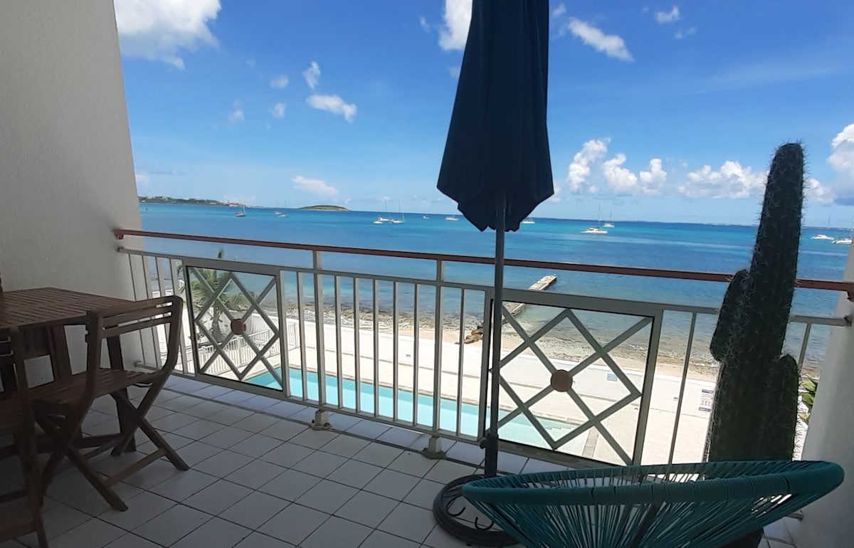 "Petit Paradis" (Little Paradise), a genuine Caribbean getaway. A spacious one-bedroom Beachfront apartment right on beautiful Simpson Bay Beach and in the center of all the happenings. Relaxing terrace, five stairs away from the Beach, and within walking distance from great Restaurants, Nightlife, Activities, and Watersports. This modern, fully furnished, and equipped apartment has everything you need for a dream vacation. Hope to invite you soon in our Paradise, Elodie