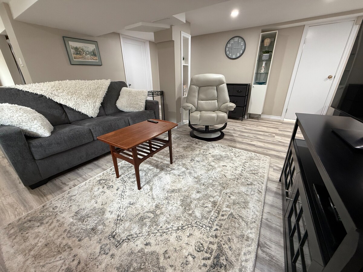 Enjoy your stay in a newly renovated basement apartment with a sauna, separate entrance, and large living room. Included is a double bed, pull-out couch, large walk-in shower, fireplace and laundry machines. Located a 5 minute drive from the airport on a quiet round-about street. A few minutes from many fast food restaurants, grocery stores and all other amenities. Street parking is available.