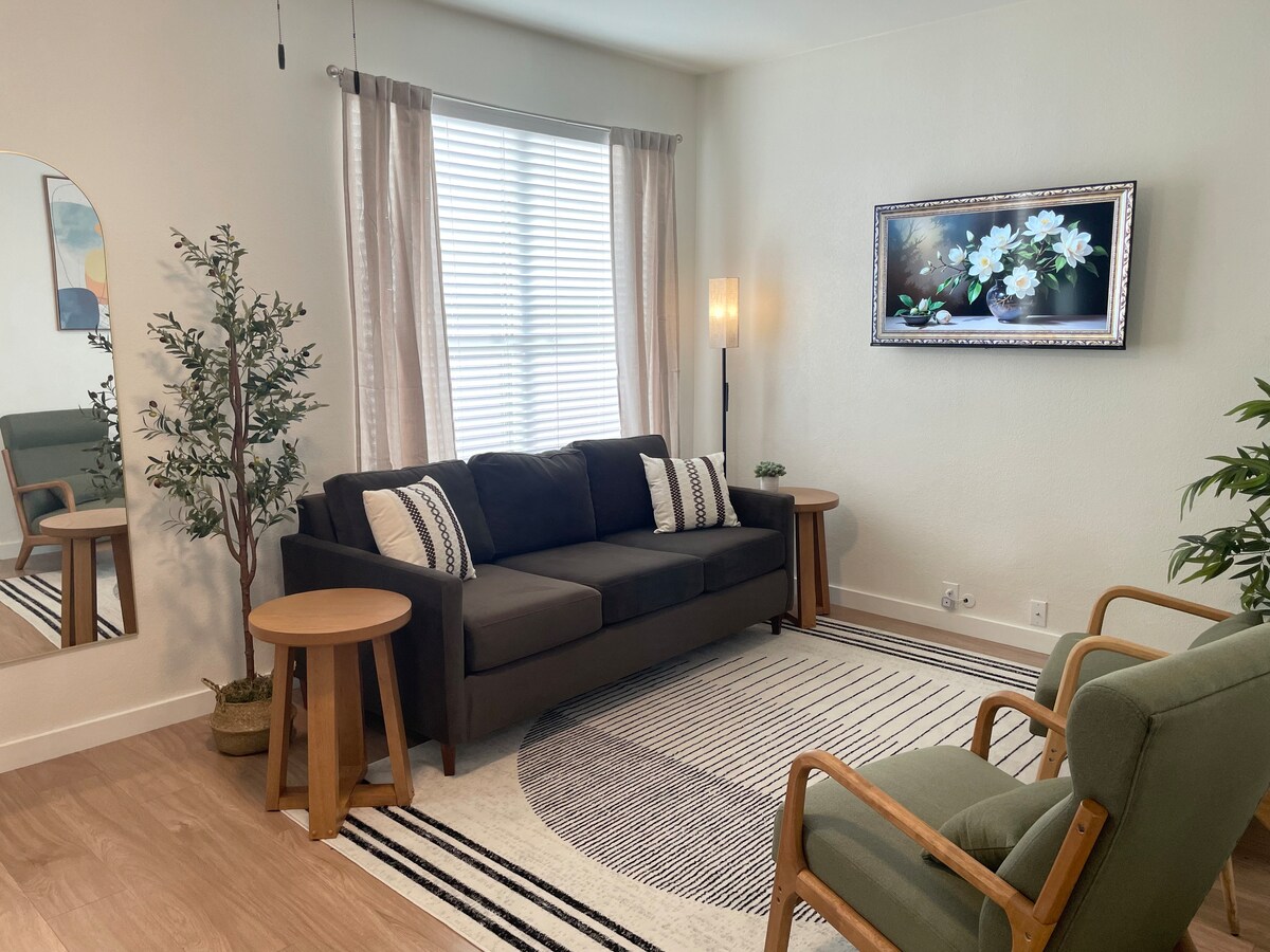 Rest, relax and rejuvenate at this unique and tranquil getaway. This private 400 square foot garage conversion is packed with amenities. Jetted bathtub, bidet, massage chair, king bed with memory foam mattress, 65” tv, home theater, fiber optic Wi-Fi, kitchenette, coffee and tea bar, cedar closet, dimmable lighting, stage 2 EV charging, driveway parking, coded access, laundry room, 2 luxury towels and 2 spa robes. The smart tv and projector have Hulu, Prime, Apple TV and Netflix for guest use.