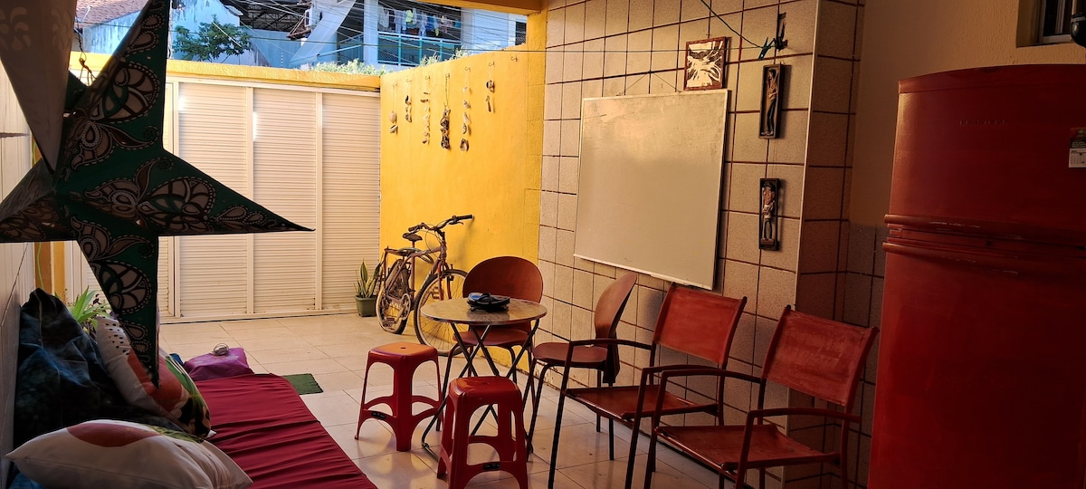 Casa estilosa, com obras de arte, numa vila tranquila e segura a 15min da Praia de Iracema. É um sobrado com 130m², com 2 banheiros, 2 quartos (sendo 1 mezanino grande com cama de casal, banheiro e armário; e 1 quarto), sala, cozinha equipada e terraço - para até 4 pessoas. A Vila Nanan é numa rua sem saída, com portão, câmeras e vigilância. (há descontos para estadias maiores). Espaço inteiro privativo. Festas e eventos não são permitidas.