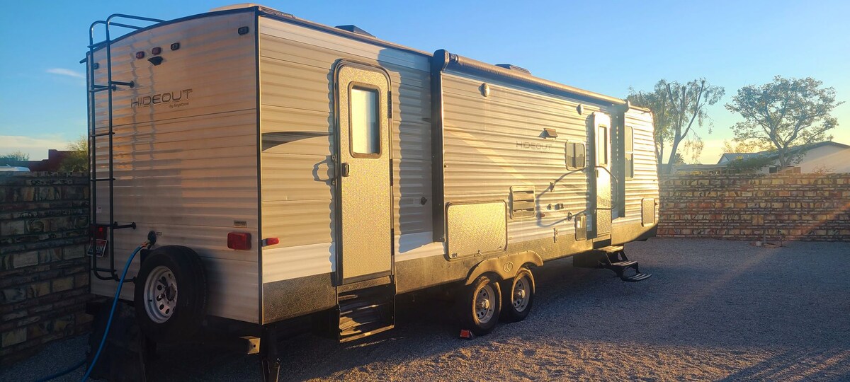 2018 Keystone Hideout! 31 foot from tongue to bumper. 1 large slideout with couch and dinette. Extra large bunk beds, full bathroom, fridge, freezer, 3 burner stove, oven, sink, central vacuum, seperate master with upgraded mattress, 2 doors, automatic awning, outside kitchen with 3 burner pull out cook top, sewer, hot and cold water, and power. RV is located in the beautiful foothills of sunny Yuma, AZ.