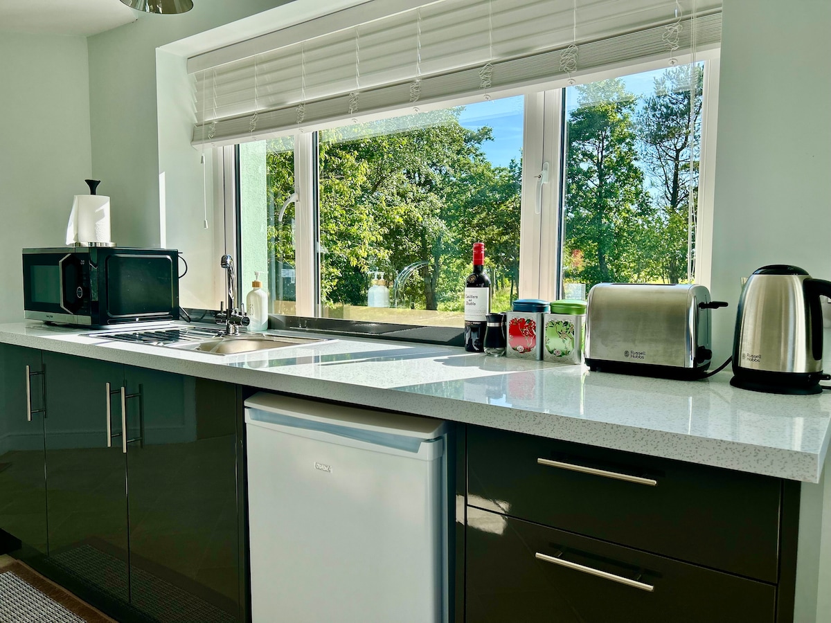 Panoramic mountain views can be enjoyed throughout the studio, with large windows filling the space with natural light from morning to evening. The open layout keeps the scenery always in sight, creating a calm, spacious feel whether you’re relaxing or working. Set in a quiet location near Douglas, with generous parking for cars, vans, trailers, and bikes. 10 mins from Airport & Ferry.