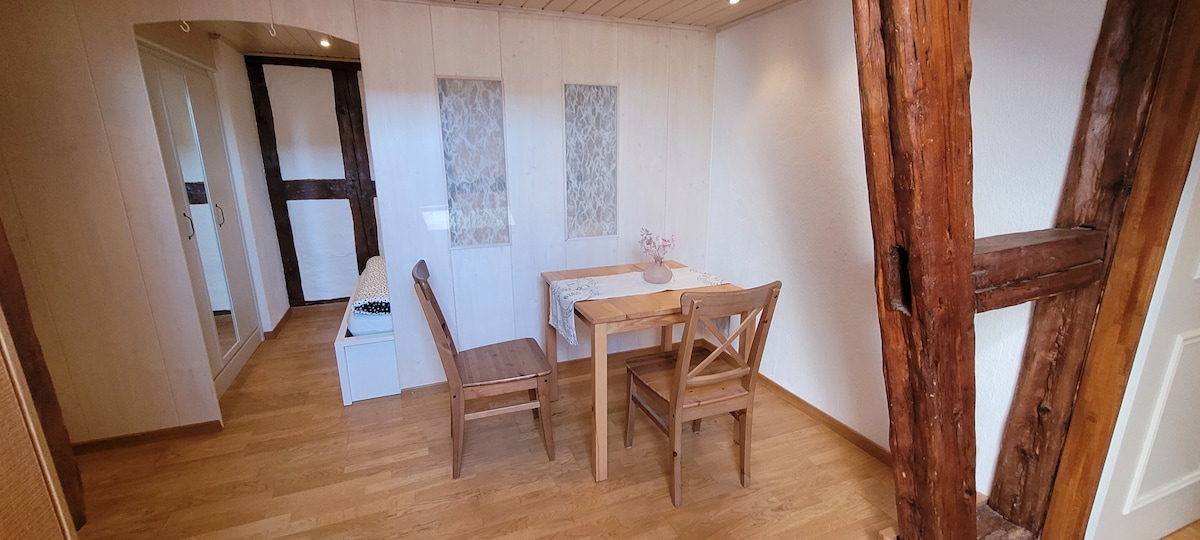 Stilvoll eingerichtet, in einem ehemaligen Bauernhaus, in ruhigem Dorf. Die geräumige Wohnung im ersten Stock verfügt über ein Schlafzimmer mit Doppelbett und einer Schlafcouch im Wohnzimmer. Die Küche ist gut ausgestattete mit Kochherd, Backofen und Mikrowelle. Die Kaffeemaschine und die Morgensonne lassen Dich gut in den Tag starten. Der Gartensitzplatz lädt zum gemütlichen Ausspannen ein. Die ländliche Umgebung ist perfekt zum aufranken und abschalten. Auch beim gemütlichen Abendspaziergang.