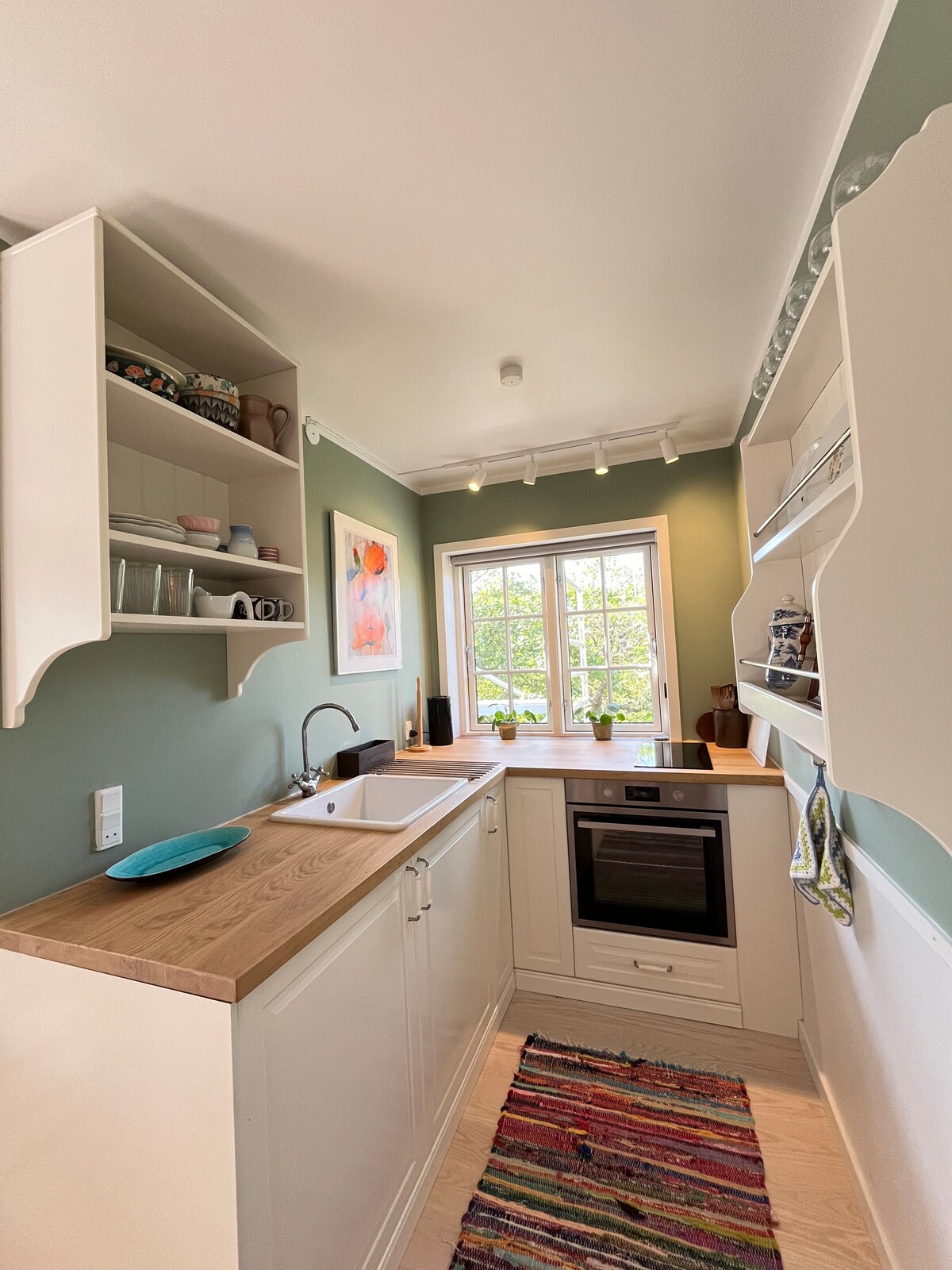 Lovely year-round insulated guesthouse, of approx. 17 m², with lots of charm, located in the middle of Gribskov, 6 km outside Hillerød. Here is room for 2 people with a large room with double bed, dining area and open kitchen with burner and the possibility of light cooking. In addition, there is a nice little bathroom with underfloor heating and a shower. The house is perfect for a romantic get-away or as a writing den if you need peace and quiet a few days for contemplation.