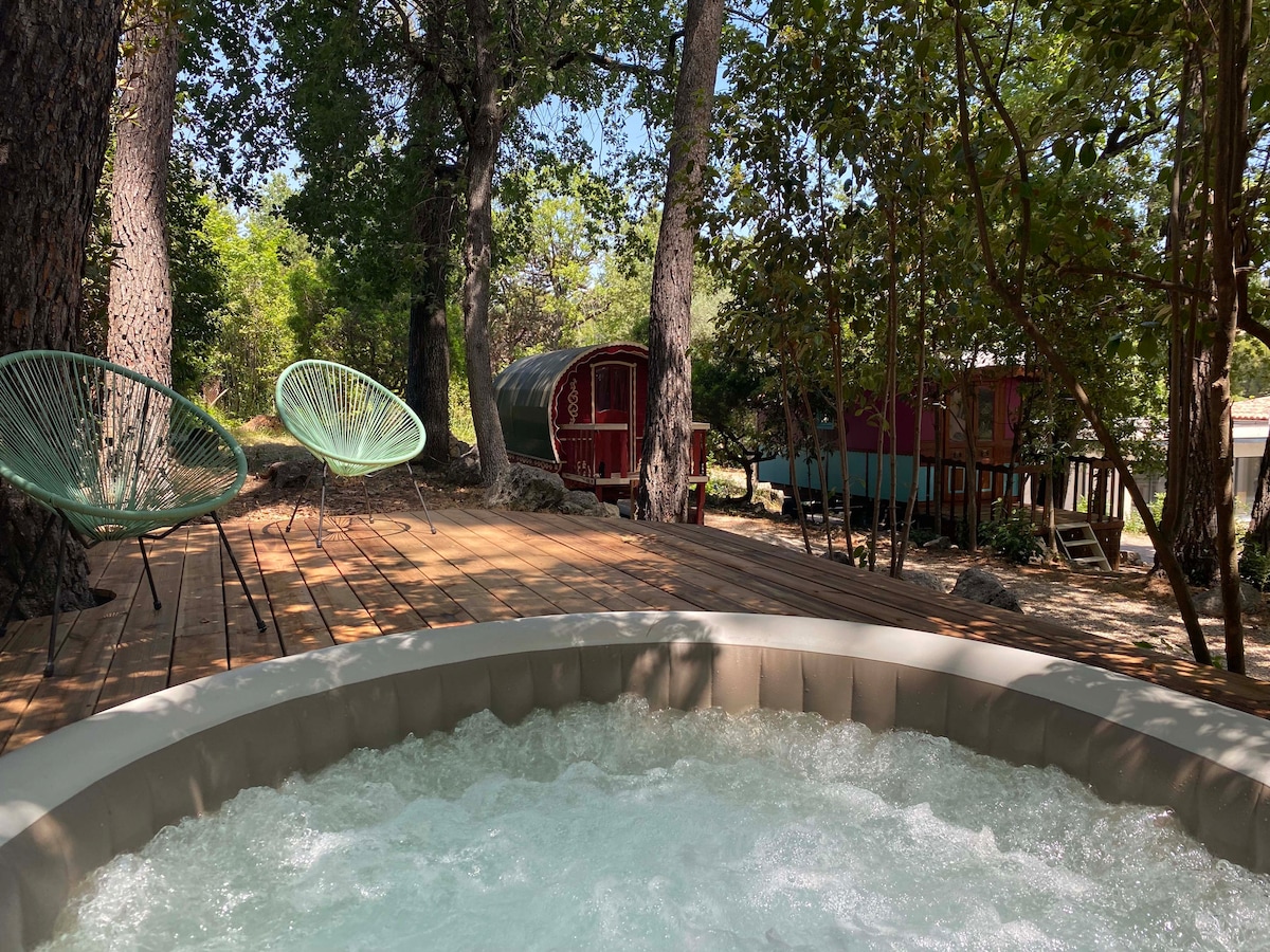 Charming gypsy-style trailer with jacuzzi area (extra charge except July August*). Ideal for two people but possibility to accommodate two children under the age of 12 under the main bed**: - 2 beds of 140 x 190 - 1 travel cot on request * Excluding July and August, on-site surcharge of €20 for filling and heating the jacuzzi ** on-site surcharge of €20 per additional person beyond 2.