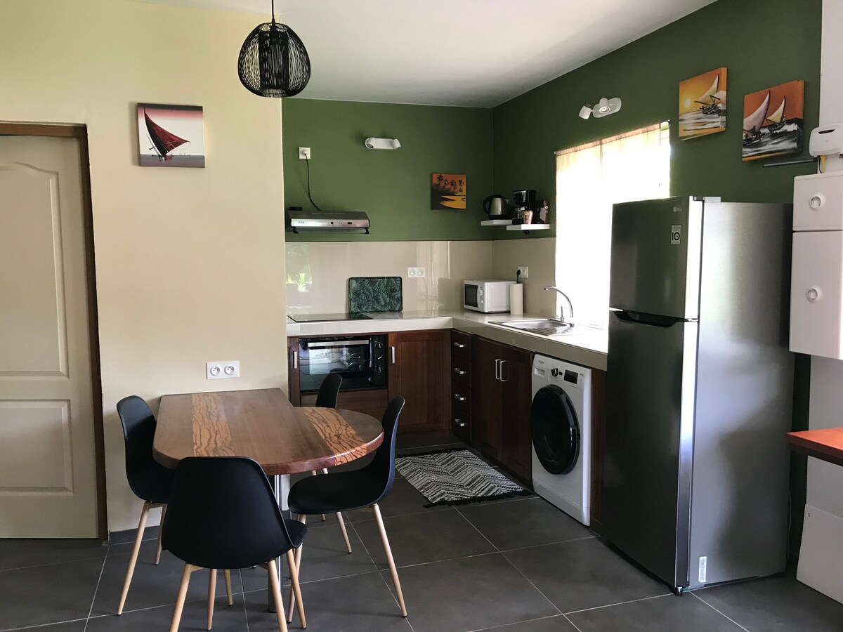 Independent, spacious and comfortable studio, overlooking a garden, in a private fenced property. Well-maintained amenities: "extra-wide" bed, beautiful equipped kitchen, washing machine. Located in the heart of the residential town of Montjoly, 13 km from Félix Eboué Airport and 8 km from downtown Cayenne. Shops, restaurants and beaches nearby. Ideal for discovering Guyana as a couple or for a business trip.