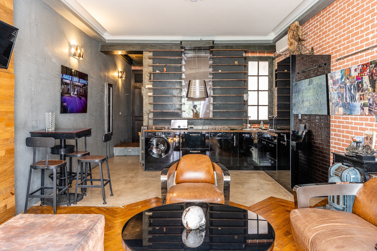 Refurbished 49 m2 loft in the heart of Nice opposite the SNCF train station – ideal for discovering the French Riviera! This accommodation has a beautiful fully equipped open-plan kitchen, a bathroom with walk-in shower + island bathtub and double sink, a living room with 2-seater sofa bed, mobile air conditioning, electric fireplace, a large dressing room and a 90 cm high mezzanine with double bed. This accommodation has all the comforts for a stay with friends and family.