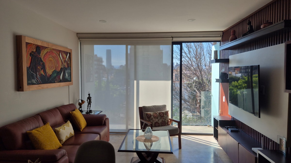 Enjoy this spacious and beautiful apartment, very bright and with double-height ceilings. Decorated with warm wooden floors and great Mexican furniture. 5 stars in cleanliness and care. With autonomous check-in. An ideal place to rest and discover Mexico City. It is in the new DOMAIN TOWER, in an excellent area of the Ciudad del Sur of Mexico City. We have high-speed Wi-Fi: more than 100 Mbps. There is a modern and well-equipped gym in the building.