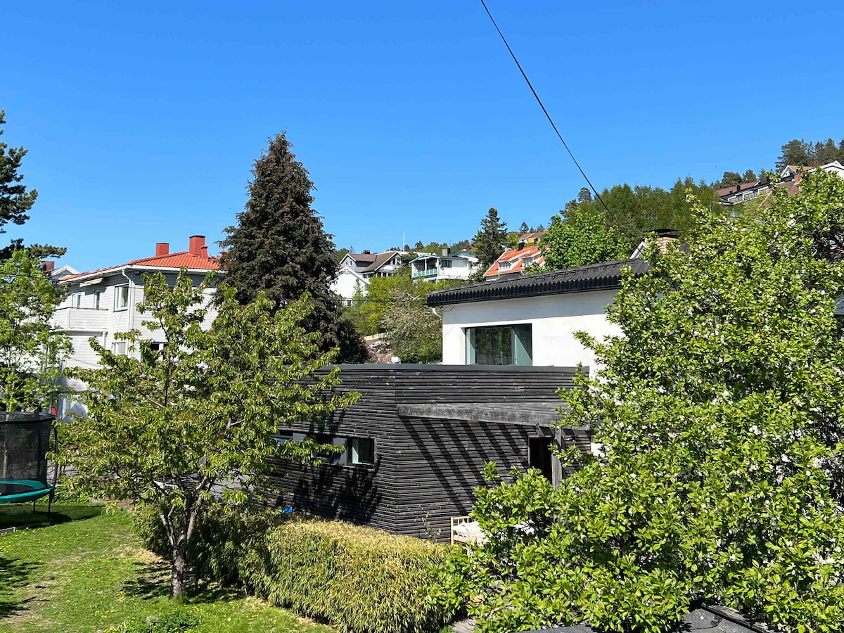 Have a 70 m2, 2-bedroom flat, with heated floors and a fireplace all for yourself. A secluded graden with dinnertable, hammock and a campfire pan, two stable kayaks with wet suits and life jacets are at your free disposal. Fantastic opportunities for outdoor life and relaxation and just one hour from the heart of Oslo. Communication by bus and ferry every 30 minutes.