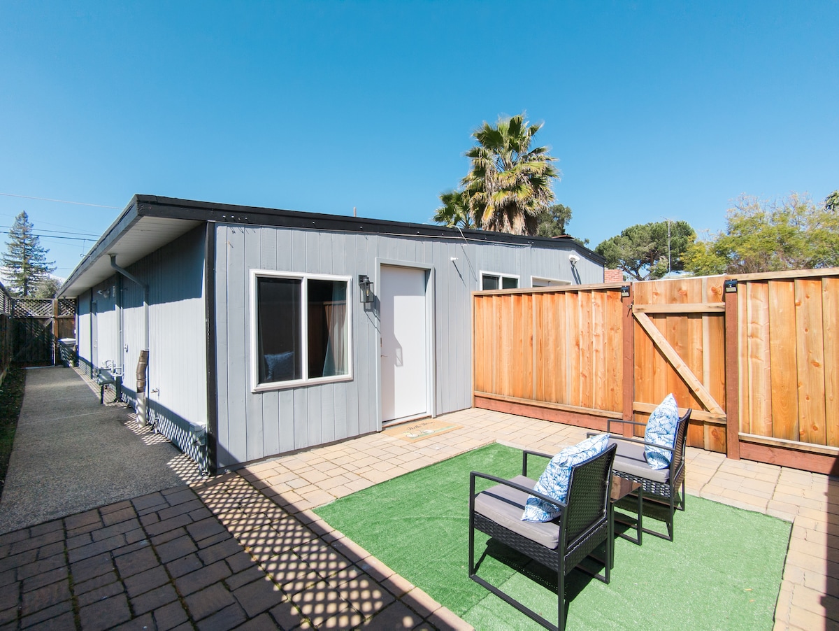 Modern, newly built 1BR/1BA private suite with its own entrance—no shared spaces. Located near Santana Row, Valley Fair, and 10–15 mins to Apple Park. Enjoy a bright, quiet space with a queen bed, workspace, fast Wi-Fi, and cozy patio. Walk to dining and shops. Ideal for business travelers - close to Apple and Google shuttle stops. Enjoy a peaceful, modern retreat all to yourself.
