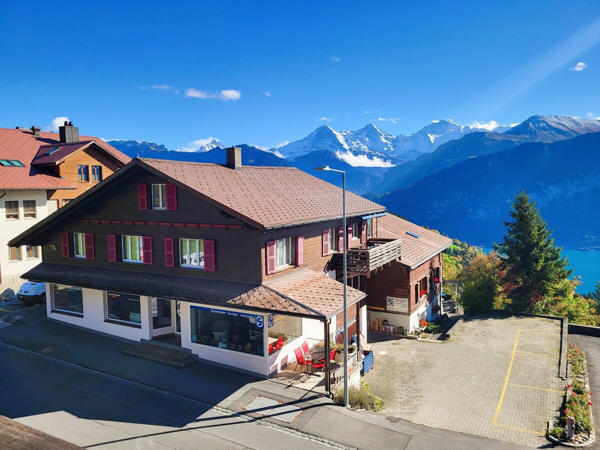 Dieses tolle Chalet verfügt über eine super Aussicht auf die Bergwelt und den Thunersee. Gelegen ist es in Beatenberg dem längsten Dorf Europas. Gute Busverbindunge ab Interlaken West (ca. 20 Min. Fahrzeit.) Mit dem Auto benötigt man etwa 12 Min. Somit ist das Haus sehr zentral gelegen und dennoch vom Massentour. Bevor man die tolle Aussicht geniessen kann, ist noch eine etwas steilere Treppe zu meistern. Im Winter sind zwingend gute Winterreifen erforderlich! Nach 22 Uhr keine Check-in Garantie