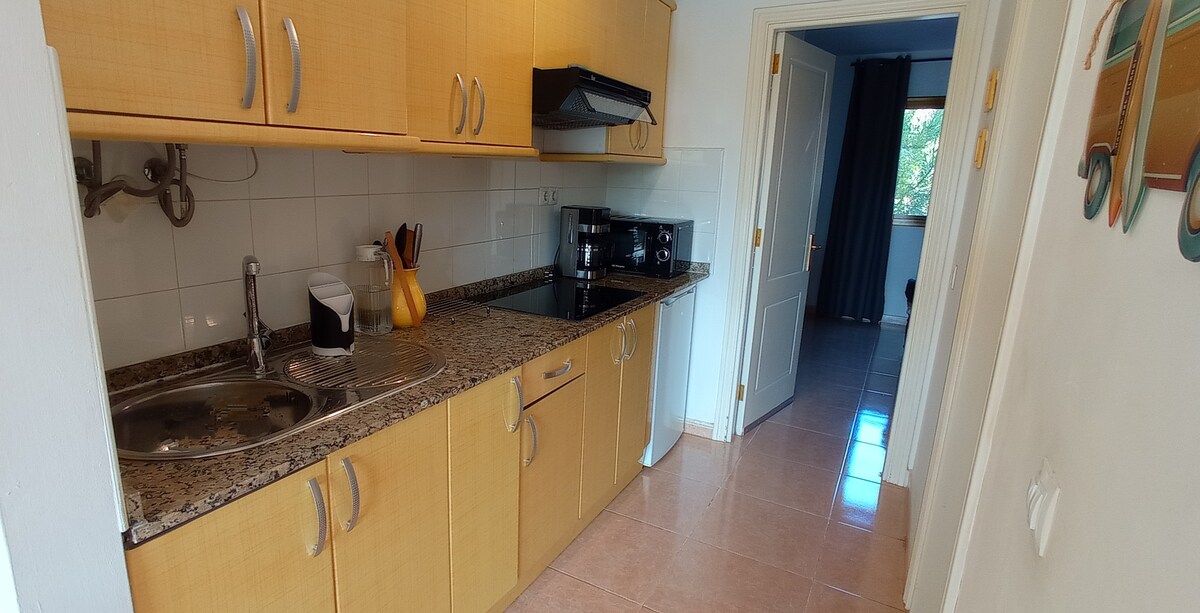 Estupendo apartamento totalmente reformado. Cuenta con dormitorio doble, baño con plato de ducha extraplano, grifería con efecto lluvia y secador de pelo, luz LED perimetral y aire acondicionado en salón y dormitorio, sala de estar con sofá cama, caja fuerte de alquiler, Smart TV vía satélite, mesa de comedor, zona de cocina con microondas, nevera, tostadora y cafetera y terraza amueblada con vistas a los alrededores. La ropa de cama y las toallas están incluidas. El uso del aire acondicionado conlleva un suplemento. Wifi gratuito.
