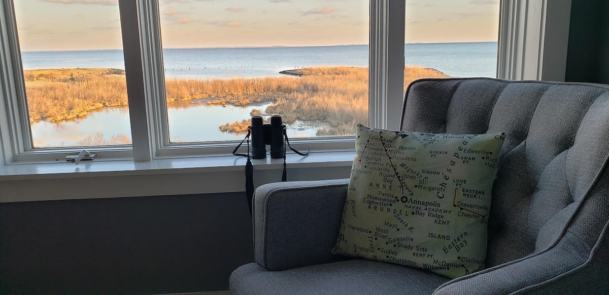 Winter at The Cottage at Silver Water is calm, clear, and quietly beautiful. Snow-dusted views and crystal-blue skies frame the Chesapeake as migrating waterfowl glide across the water. As the day ends, golden hour washes the bay in soft light, often finishing with a vivid winter sunset—quiet and unforgettable. Inside, Nordic-inspired design, a cozy fireplace, and sumptuous bedding create a warm retreat for deeply restorative rest. Discover why so many guests return by reading our reviews.