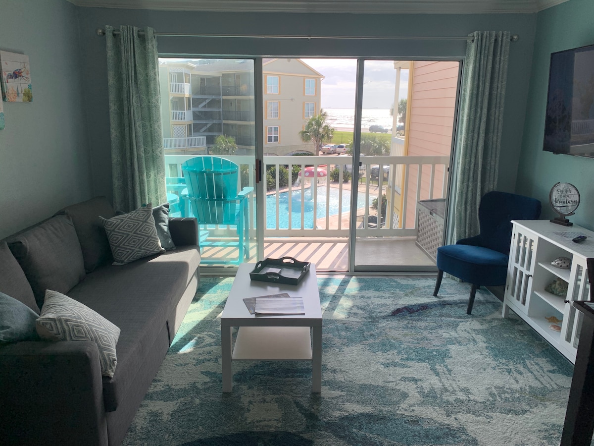 Enjoy this sunny beachfront condo right on the beach! Islander East is ON THE BEACH, not across the busy seawall blvd. You'll have a 2 bedroom condo on the 4th floor with beautiful views of the ocean from both balconies. Enjoy the new king size bed and light and bright room with optional blackout shades. The second bedroom has a bunk bed with a twin on top, double on the bottom, and a twin trundle to pull out. Beautifully decorated in peaceful beach colors, white, teal and oatmeal. Book today!