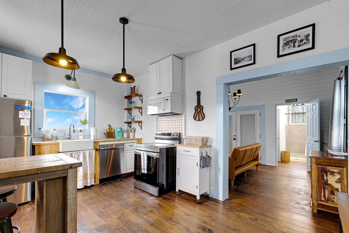 This rich in history tiny house has been newly renovated for DIY series "Restoring Galveston". Moved from its original location to its current resting spot it is the perfect distance between downtown and the beach. The home sleeps 5 with 2 bedrooms and a full bath. Primary bedroom also has direct access to the bathroom for privacy. Full kitchen makes cooking on vacation a breeze. Coffee setup complete with Kcups, creamer and multiple sweeteners. Outdoor lounging on front porch or downstairs!