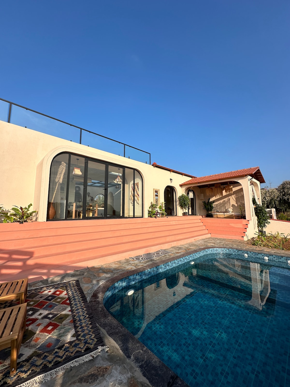 Luxurious Private Pool 2 bedroom villa with kitchen .Up to 2 adults and 1 child in each room. It is close to main road yet surrounded by farmlands, our open to sky bathroom with 24hrs hot water in one of the bedrooms is most liked by our guests.good restaurants near by and tourist places like sula vineyards(tour,tasting and restaurant), Wonder la and famous temples like Ambegalu Krishna temple.Home made food and fire camp available on request.Out door area for Badminton and Cricket