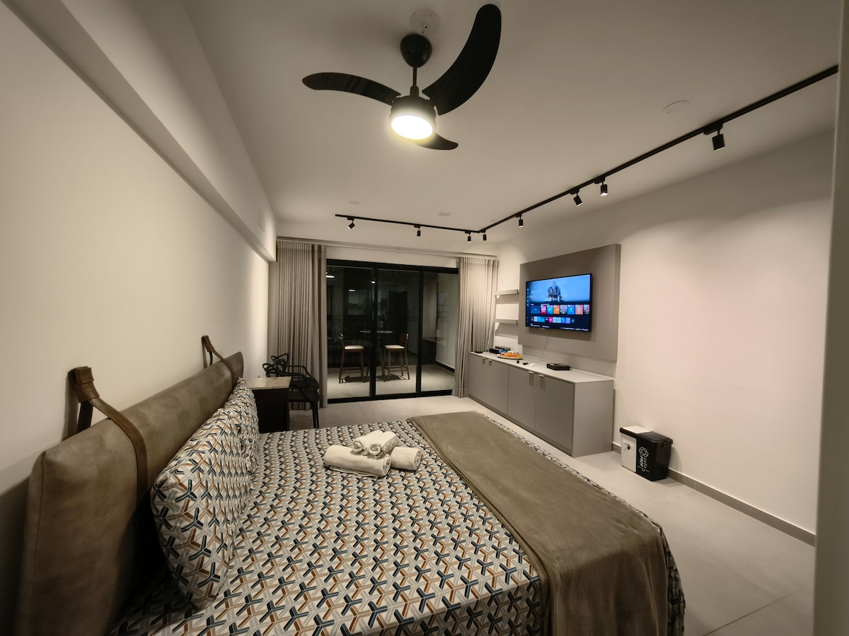 39m2 Studio Apartment, overlooking the street, shadow side, a queen bed + sofa bed. Hosting 2 adults and 2 children or up to 3 adults to be comfortable. Air-conditioned and with all the basic utensils, free parking. Located in the best region of Marília , next to Avenida das Esmeraldas, close to supermarkets, bars, restaurants, beauty salons and pharmacies. The condominium of the building also has a Coworking space, gym , and free laundry space.