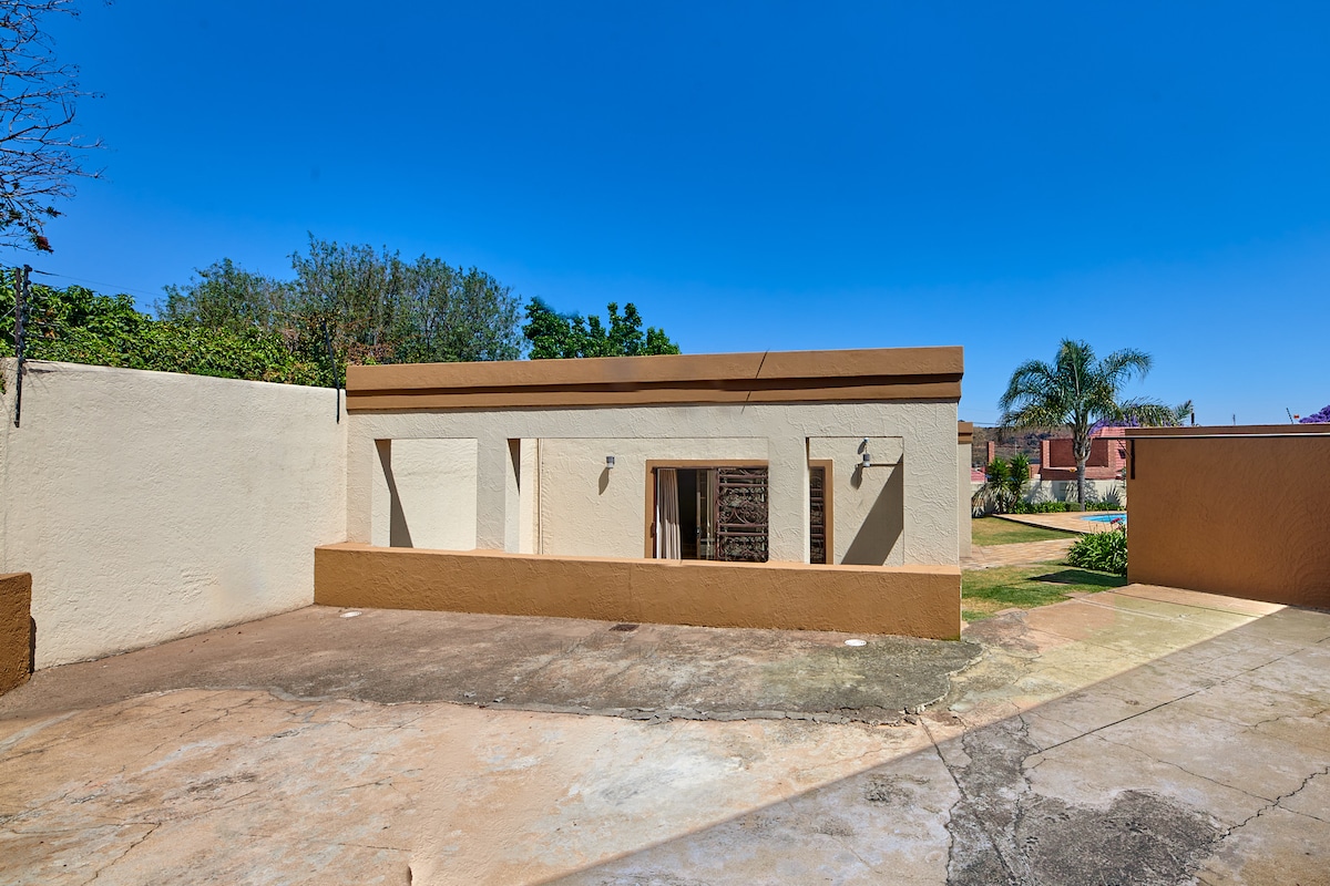 Situated in Brackenhurst,Alberton. Step into a modern and spacious 40 sqm self catering unit. Kitchen fully equipped with a stove, oven, microwave, fridge and a washing machine. An open plan lounge with a comfortable couch. Wi-Fi, 32'TV with Netflix. The bedroom has 2 single beds & build in cupboards. The bathroom has a huge walk in shower, basin & toilet. Parking is behind a remote control gate with enough space for 2 cars. Relax around a sparkling swimmingpool or sip on a drink under the lapa.