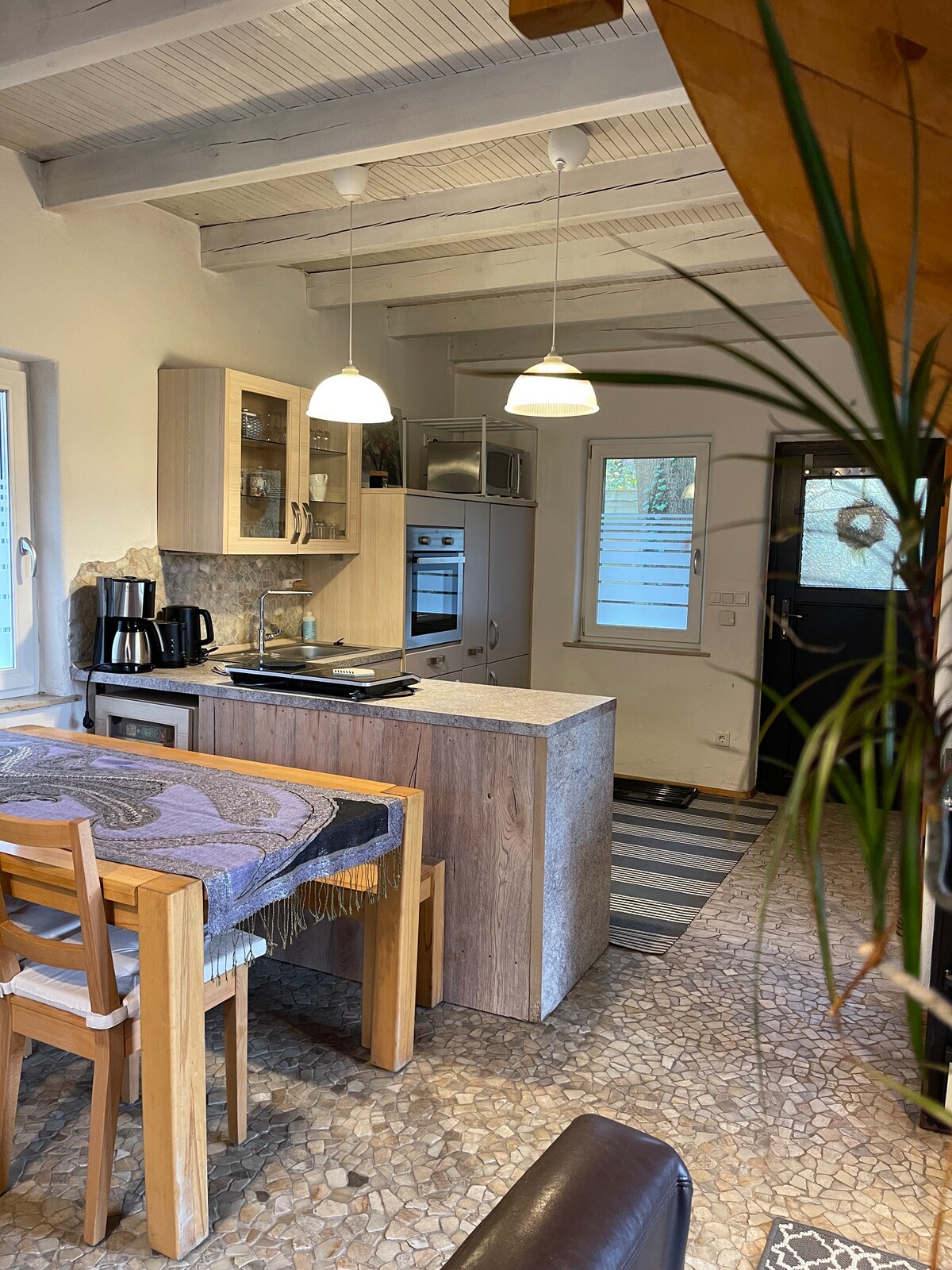 Lovingly designed half house with its own entrance and garden area – quietly located and surrounded by nature. On about 70 m², two bedrooms with double beds, a bathroom with tub and shower and a cozy living room with dining area await you. The modern kitchen is fully equipped with an oven, dishwasher and fridge – ideal for couples, families or city dwellers looking for peace and quiet.