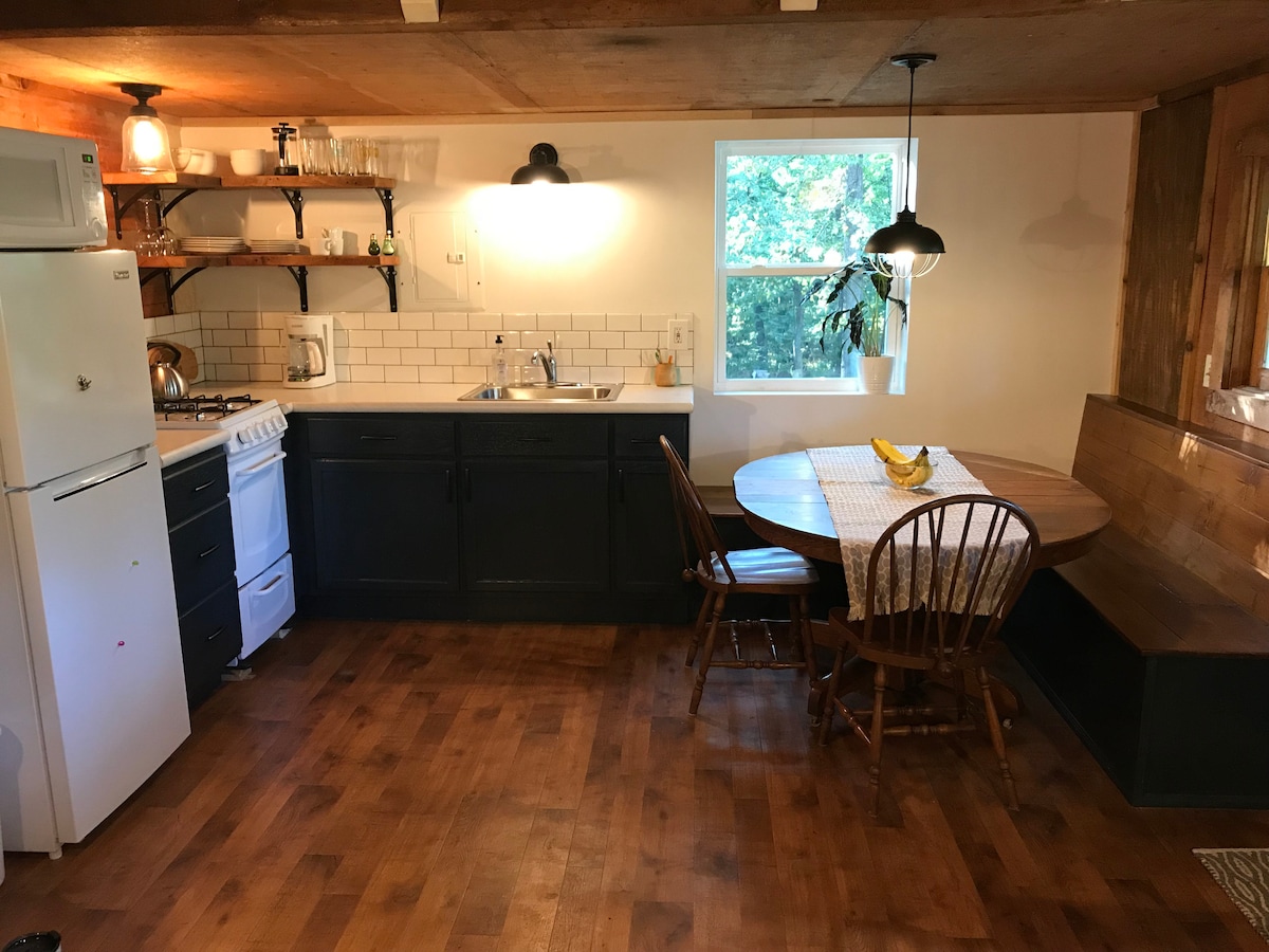 If you want a retreat where you can sleep in, slow down and savor nature's beauty, the Blue Door Cabin, tucked in surprisingly hilly oak and hickory woods, with a beautiful view of the pond, is your destination. Within two hours from Kansas City, Tulsa, Joplin or Wichita, and only 4 miles from Chanute Kansas, this preserved and revived cabin offers an easy getaway for city dwellers in need of a very affordable anniversary weekend, study or solitude retreat, or family hiking and fishing trip.