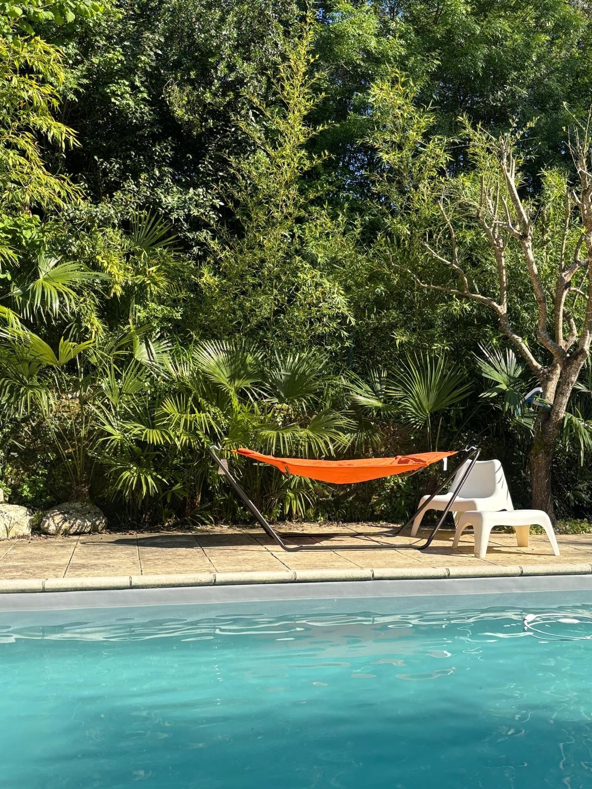90m2 cottage with 2 bedrooms at the ends each with toilet, shower. In the center, an open kitchen that divides a relaxation area on its right (TV, sofa) and a dining room on its left. Back, dishwasher, washing machine. In front, the equipped covered terrace will allow you to eat out. At 3 meters, the pool is surrounded by beautiful palm trees. You'll feel like you're in the tropics! Behind, a petanque court, and a beautiful area to relax.