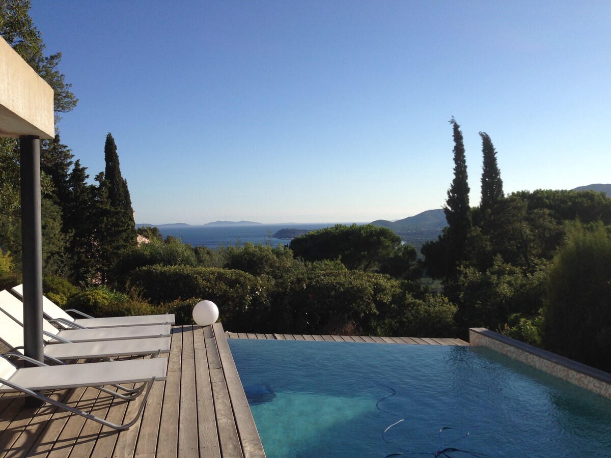 The house for rent is a 1 contemporary house of 200 m2, in a wooded and landscaped garden of 1500 m2 for 8 people. Infinity pool in mosaic secured by an electric curtain. Two magnificent views, one on the Gulf of Cavalaire sur Mer, the other on the Mediterranean countryside and the village of Gassin. 1 km from the village, 2 km from Gigaro and close to Saint Tropez while remaining quiet. Very close to the beaches. Not overlooked.