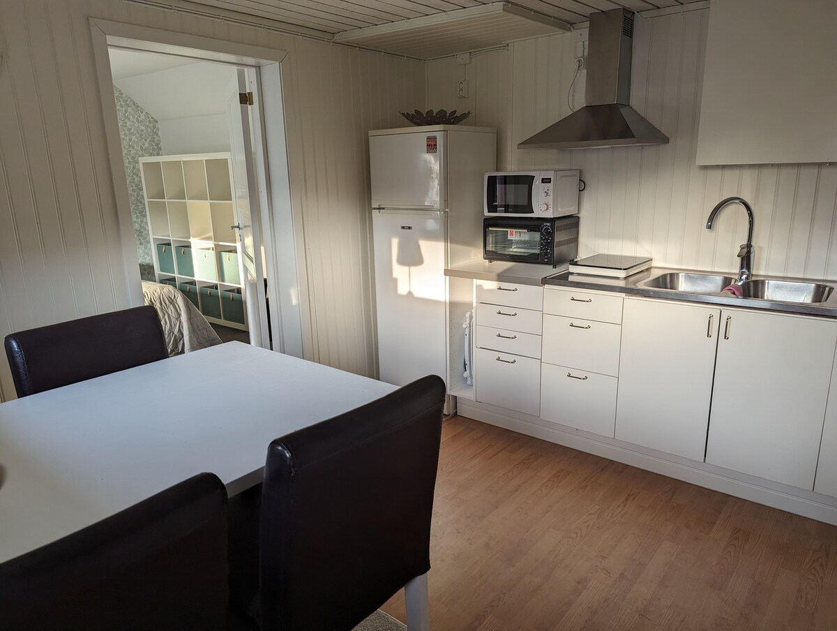 40 m2 small house with cosy sleeping loft. Built in 2019 The house also has a lovely massage chair that can of course be used unlimited. Fully equipped kitchen with dishwasher and fridge (no freezer) If you need a washing machine or freezer, it can be arranged in the main house. The bed is made and towels/bath towels and bathrobes are available for you. Nespresso machine, capsules and tea are included in the price TV and wifi are available Electric cars can be charged at our premises at cost price. Swish and grab for a cold drink and a snack box.