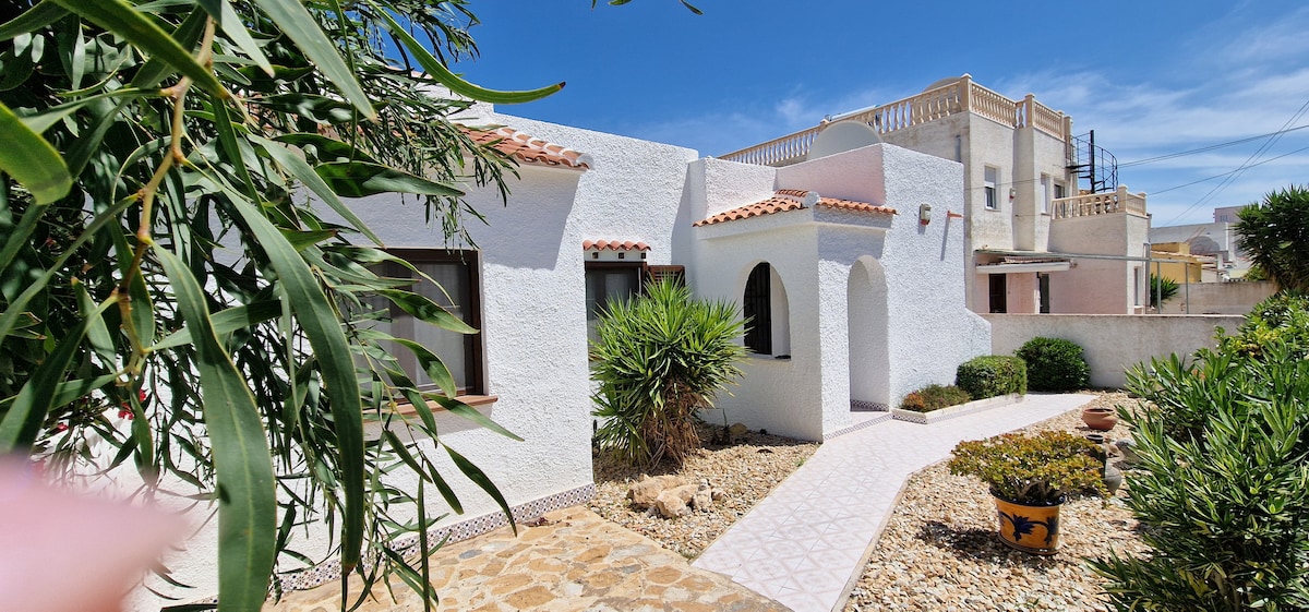 Villa La Rosa Blanca A 2 bedroomed villa with large sun terrace in the pretty village of Pinar de Campoverde. An excellent base for Golf, Hiking or Relaxing on one of the many beaches or by the village swimming pool. The village is located at the foot of the Sierra de Escalona mountain range in the province of Alicante, Spain. The town has around 3000 inhabitants and is 10km from the Mediterranean coastline, approximately 15 minutes drive through Pilar de Horadada to the nearest beach.