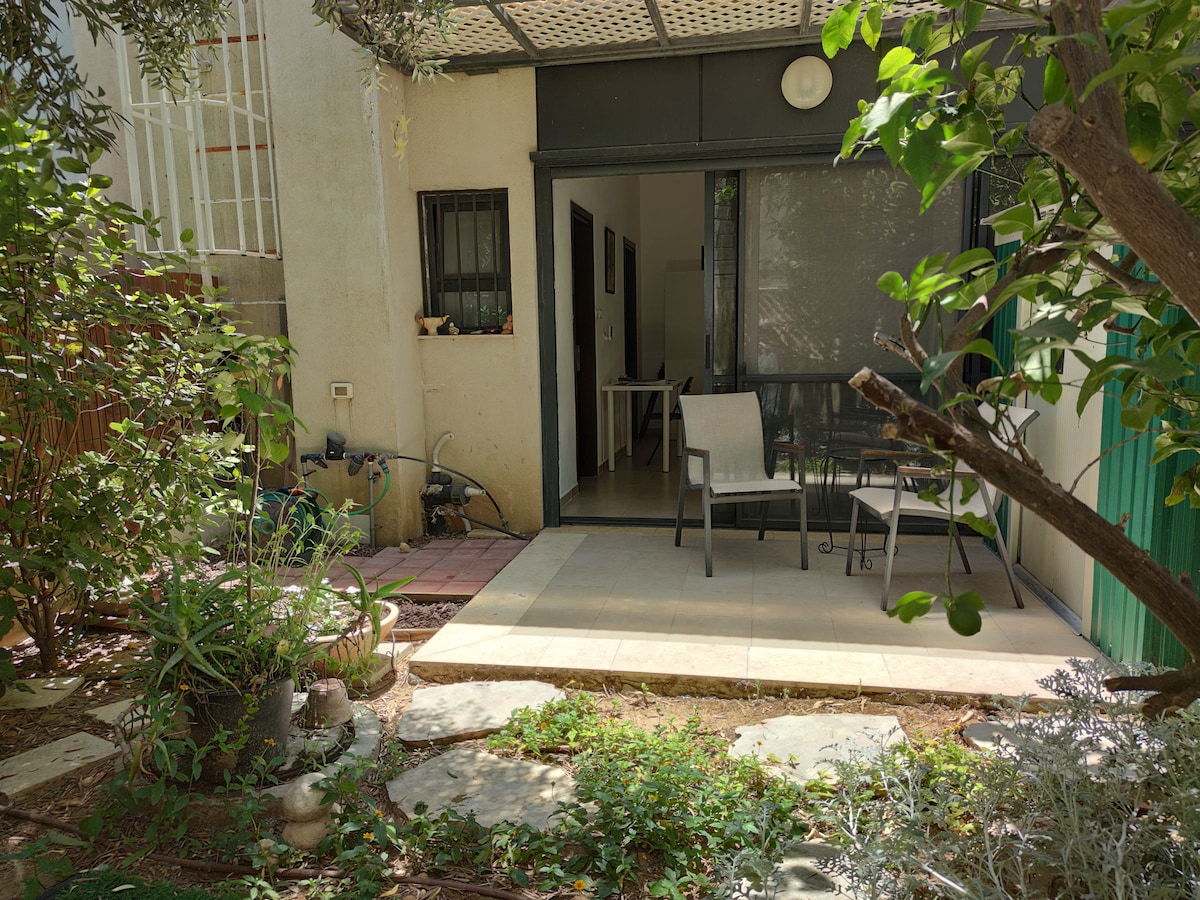Enjoy a unique quiet environment within the city. With a private entrance, our guest suite is on the first floor, overlooking a beautiful patio, lawn and garden for relaxing, dining and recreation. Enjoy organic vegetables and fruits from our garden in season. Free on street parking . Easy access to Tel Aviv, Jerusalem and TLV BG Airport. Car rental and public transportation 5 min walk. Mini market 1 min walk. Supermarkets 10min away. *We have an in-house safe underground shelter (Mamad ממ״ד)*