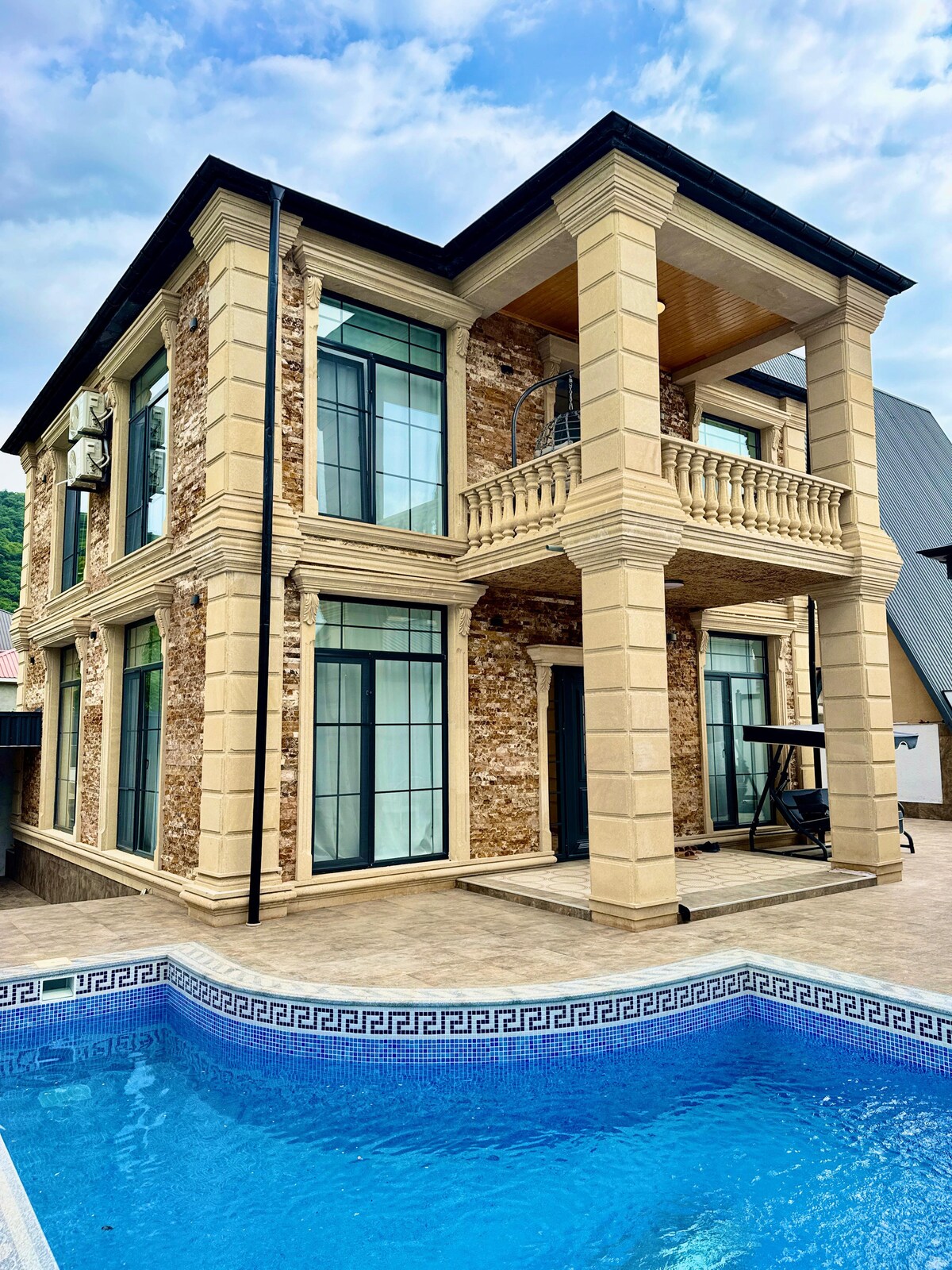 Located in Gabala city, near Gabaland Entertainment Center. House features: 3 bedrooms 2 bathrooms Comfortable beds for 6 guests 2 kitchens (indoor and outdoor) Wood-burning fireplace Amenities: Heated swimming pool Outdoor fire pit Gazebo seating area BBQ and samovar Air conditioning in every room Android TV Clean hotel-standard linens A true family-friendly home, only 60 meters from the river. Ideal for peaceful walks and relaxation.
