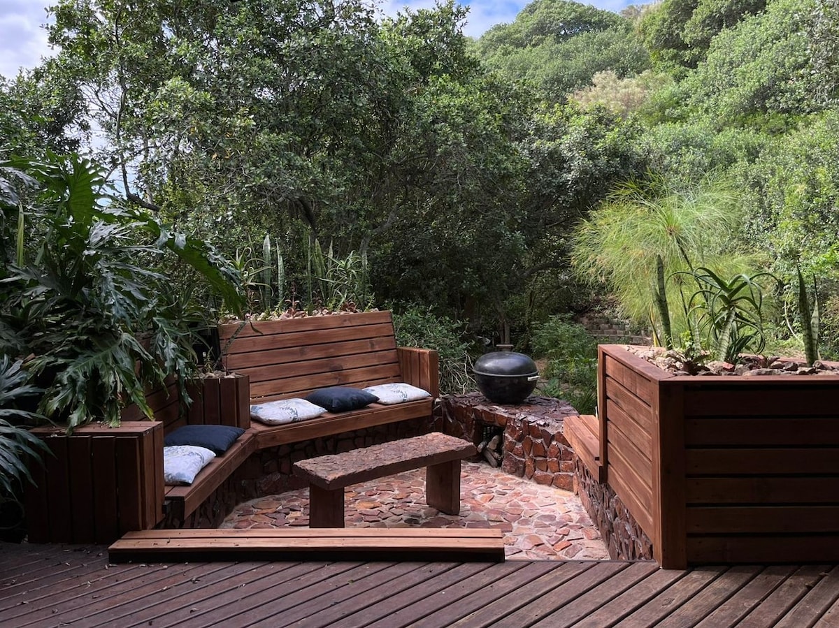 Rustic charm in the heart of the Wilderness 3km from Wilderness. A cozy forest Lodge which sleeps a total of 6, 2-4 adult guests as well as 2 children or adults in the loft. A third en suite bedroom is accessed via stairs below the Lodge should 4+ adult guests book. This beautiful wooden lodge nestled amongst the treetops is peaceful & private. Cozy living spaces with small open plan kitchen and private deck with views of the ocean and forest. Communal rock pool and bbq area on the property.