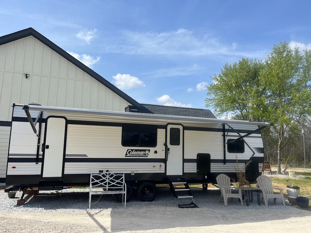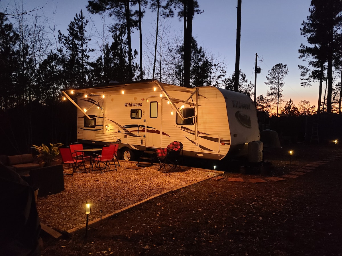 Come relax and enjoy camping without the hassle! Our remodeled 19-foot camper sits in our backyard on 4 wooded acres, just 15 min from stores and attractions. Enjoy nature with an outdoor sitting area, private fire pit, grill, and access to our playground. Perfect for a cozy getaway under the stars and a great base to explore nearby sights and activities. No pets or service dogs due to our child’s severe allergies.