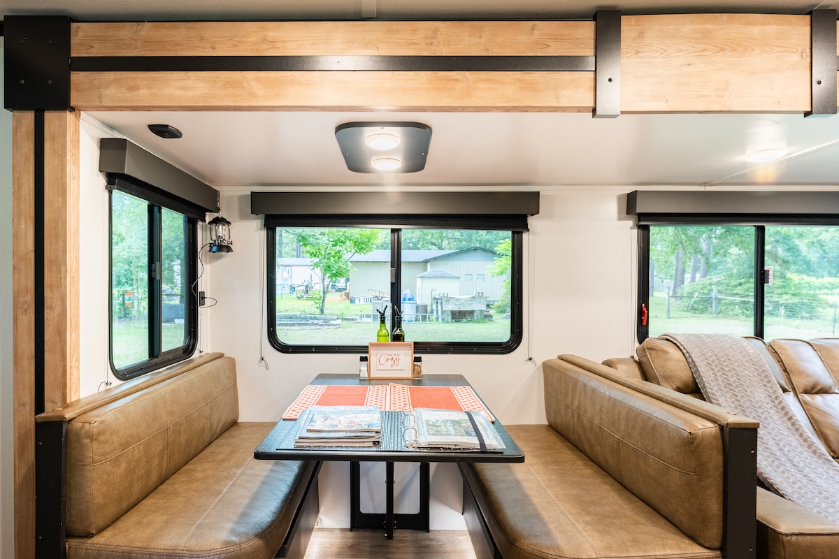 Glamping at its finest. This unique space gives you the opportunity to enjoy a camping like experience without giving up the amenities that you love. We have set up a very roomy and modern 5th wheel camper equipped with everything you need on a space that offers a spacious fire pit, swings overlooking the woods and cute cows roaming. You will feel like you are far away from busyness, but you are still close to restaurants, hiking trails, stores, and anything else that you may want to enjoy.