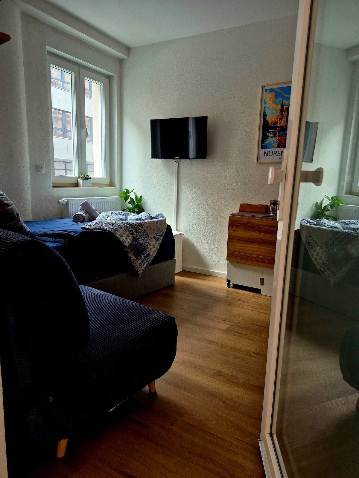 The apartment is in a quiet region in the North of Nueremberg. It's very suitable for two persons. The next Tram station is 5 minutes away. particular importance is attached to disinfecting the accommodation /bed linen. Contactless Check-in is possible. Parking places for free. The room fits for 2 persons with a twin bed. Coffeemaker, Microwave and minibar are available.Also a waterheater for tea.