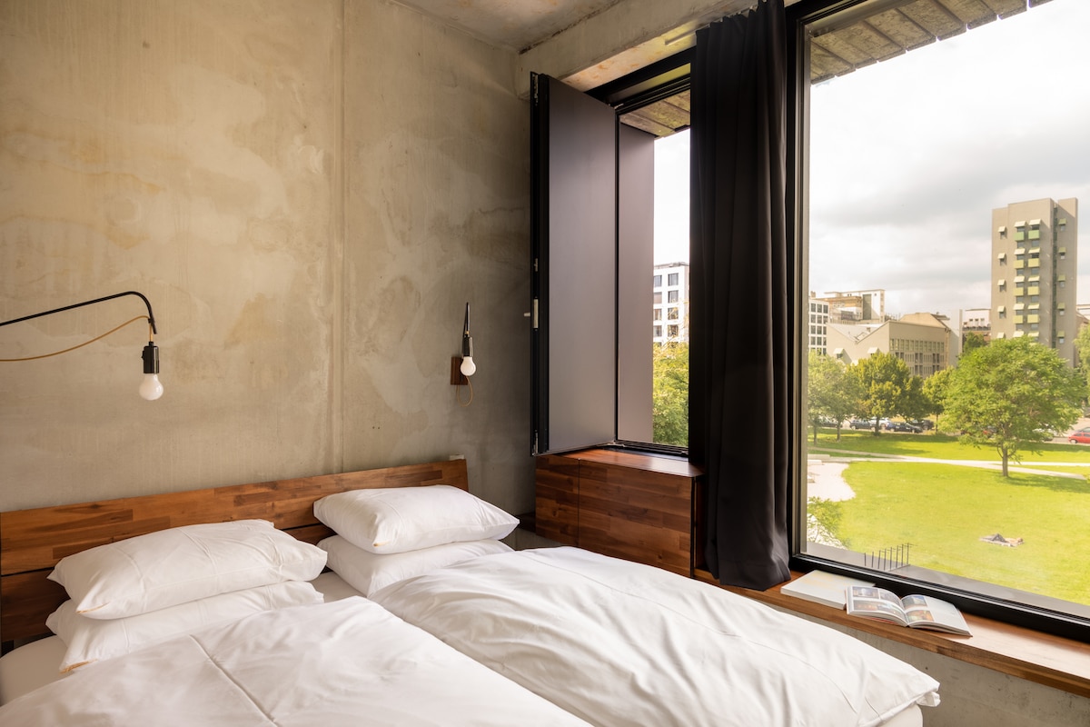 Our Zweifach Minilofts are ideal for up to 4 people. Within their 40 sqm there is a separate bedroom with a queen sized bed (160 x 200 cm), a living room with two sofas that convert into single beds, an open kitchen with a large table for working or dining, and an ensuite bathroom with a shower. All Zweifach Minilofts have large windows with either north views to the park, or across the city square to the east.